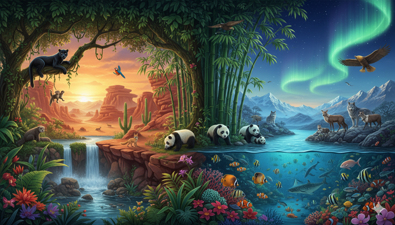 The Earth is home to an astonishing variety of life forms known as flora (plants) and fauna (animals). Together, they create balanced ecosystems that support life on our planet. From the frozen Arctic tundra to the humid rainforests of the Amazon, every region holds unique species that play crucial roles in maintaining nature’s balance.